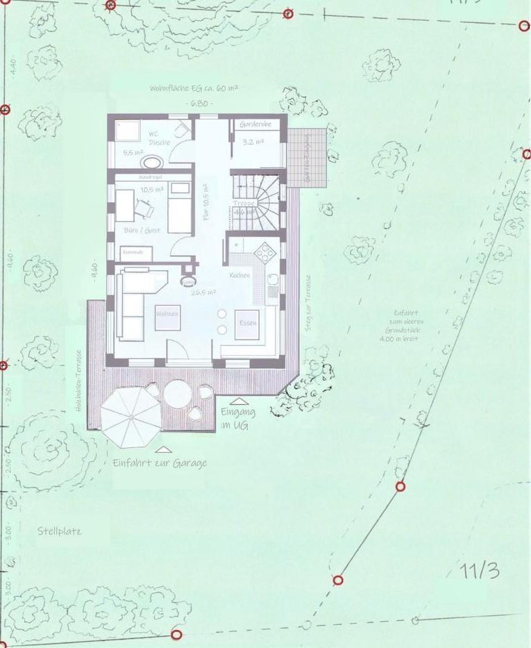 Es hat eine Fläche von ca. 434 m² und lässt sich mit einem kleinen Einfamilienhaus bebauen. Ein entsprechender Antrag auf Vorbescheid wurde bereits von der Gemeinde angenommen. Das Grundstück beinhaltet eine ca. 100 m² Zufahrt zu dem innenliegenden Gebäude.